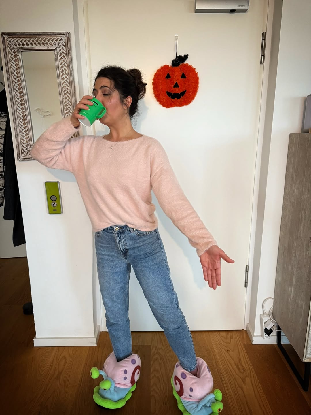 Pacini: Dieses Bild ist bei meiner besten Freundin entstanden – sie ist wie eine Schwester für mich. Und diese Schuhe, diese Puschen, hat sie schon ewig. Sie sagt immer liebevoll, dass ich manchmal Dinge trage, bei denen sie denkt: Aus welcher Generation kommst du eigentlich? Und dann ziehe ich sie an, und plötzlich funktioniert es. Für mich war das so ein Moment, den ich festhalten wollte, weil er zeigt, wer ich auch bin – jenseits der Bühne. Ich liebe es, zu Hause zu sein, mich einzukuscheln, auch mal völlig absurde Kombinationen zu tragen. Ich habe zum Beispiel auch einen Overall in Form eines Pelikans. Das gehört genauso zu mir.